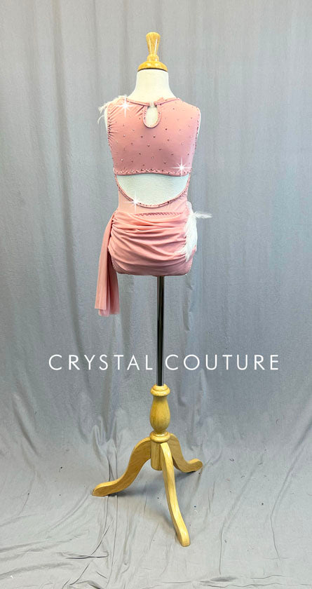 Custom Light Pink Connected Two Piece Leotard with Attached Back Mesh Skirt - Feather Appliques & Rhinestones