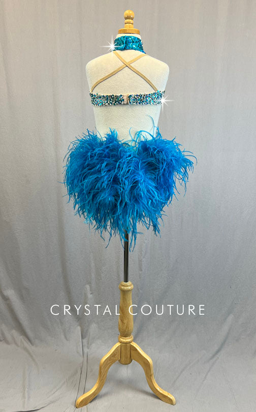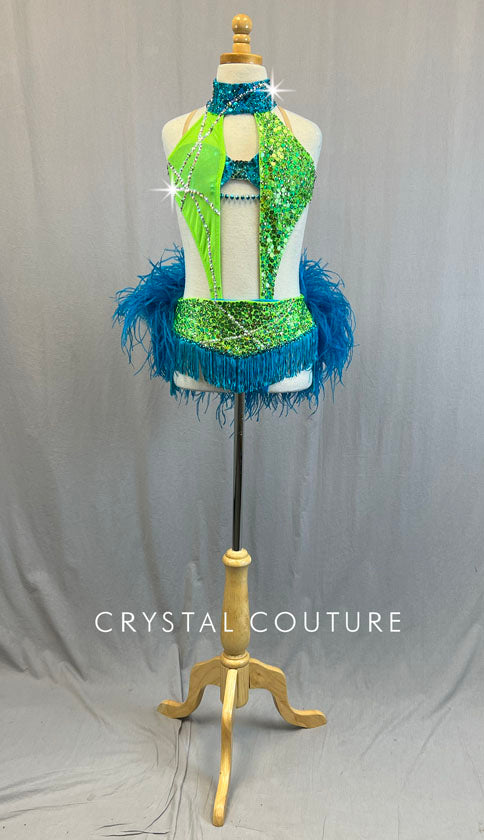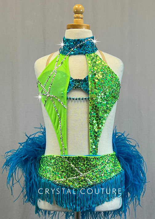 Custom Lime Green & Bright Blue Connected Two Piece with Fringe and Feather Bustle - Rhinestones