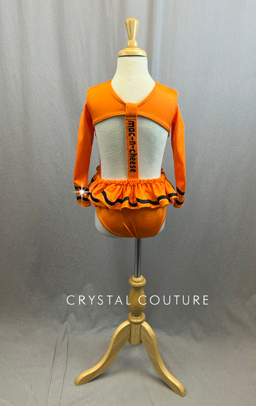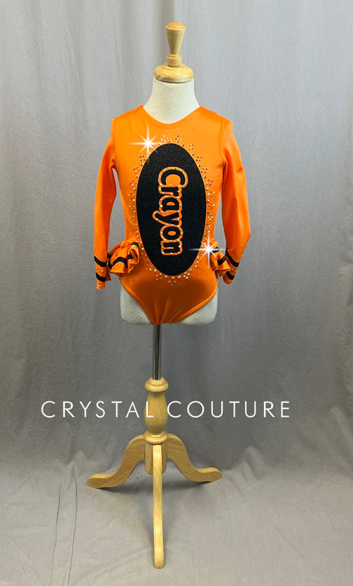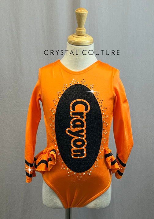 Adorable custom long sleeved Crayon leotard with front torso logo in Black sparkly vinyl. Traditional Black wavy crayon details along wrists and ruffles. Over a gross of Unfoiled Crystal AB rhinestones add that sparkle for the stage for this unique and fun design.