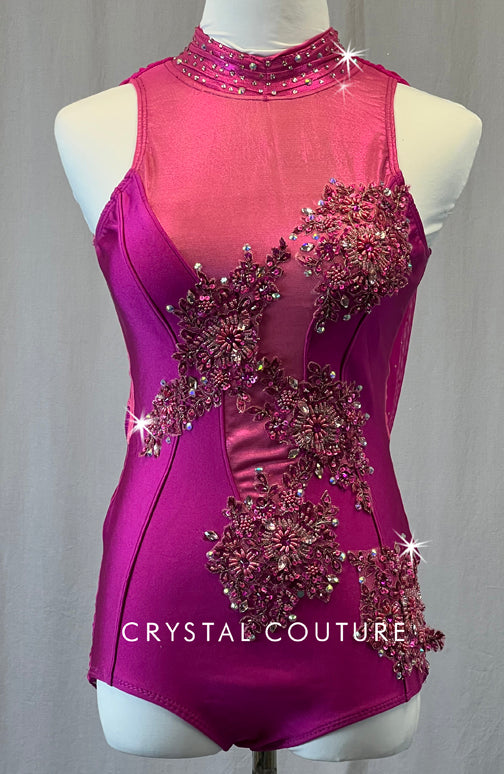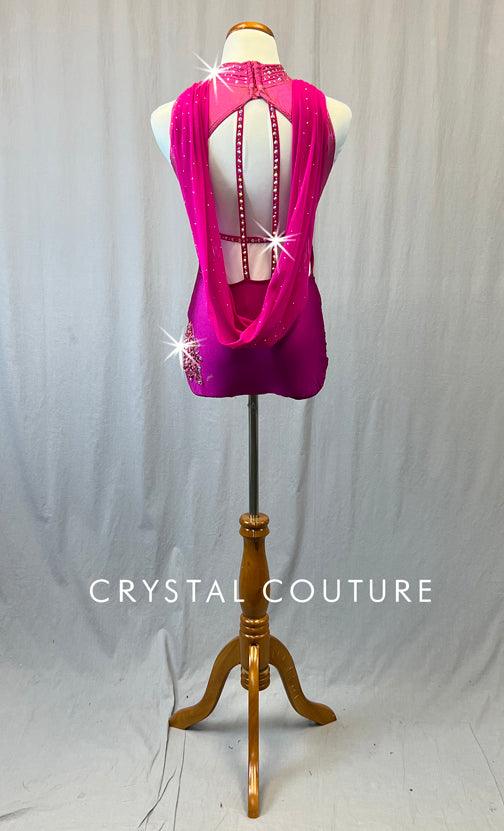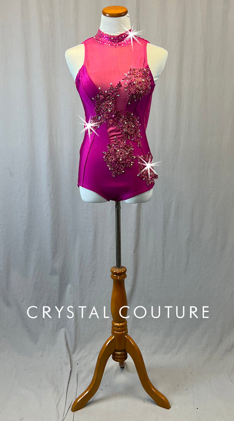 Custom Magenta Mock Neck Leotard with Appliques and Mesh Back Drape - Rhinestones