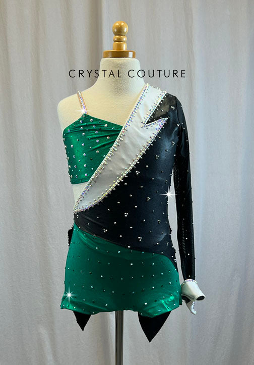 Custom Metallic kelly green lycra biketard including separate bra top with nude spaghetti straps, tuxedo style single black mesh sleeve on left side with metallic white cuff of biketard portion. Classic tuxedo coat tails are attached to biketard as well. Metallic green portion of costume is accessorized with 1 gross Emerald rhinestones while the rest of the costume is loaded with about 3 gross of both Jet Hematite and classic Crystal AB rhinestones.