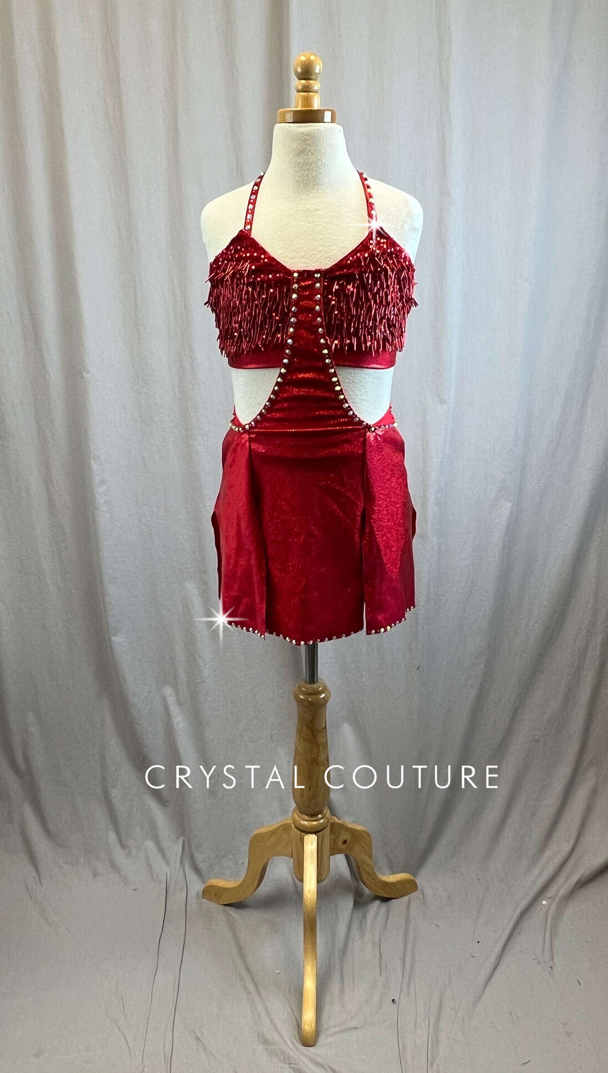 Custom Metallic red sequin and beaded fringe lycra dress with high slits on either side of skirt. About 2 gross worth of Light Siam and Crystal AB rhinestones added to costume for additional sparkle.