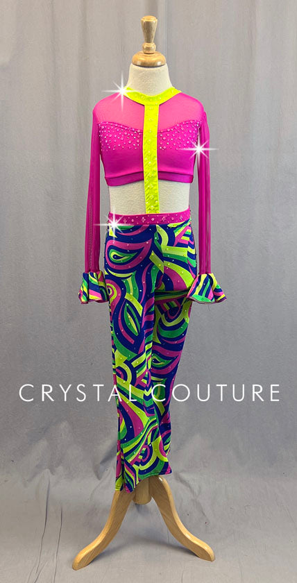 Custom Neon Disco Two Piece with Mesh Flare Sleeves and Bell Bottoms - Rhinestones