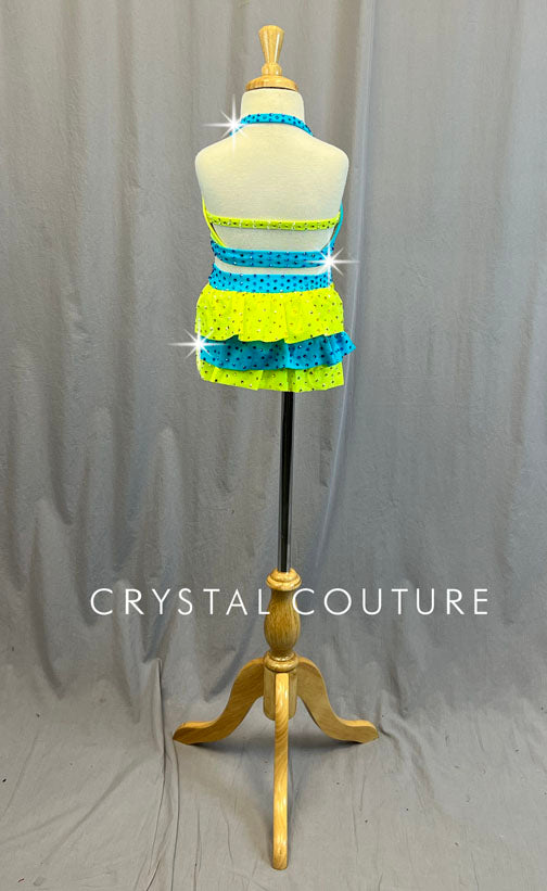 Custom Neon Yellow & Blue Two Piece with Layered Back Skirt - Rhinestones & Appliques