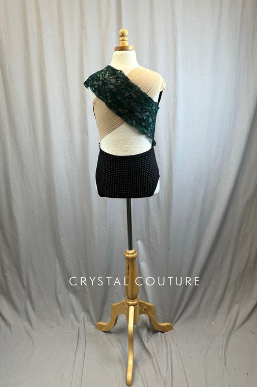 Custom unique nude lycra leotard with wide criss cross straps in the back. Black lycra jersey attached to leotard. One of the wide criss cross straps is a metallic evergreen color lace while the other is the nude lycra.