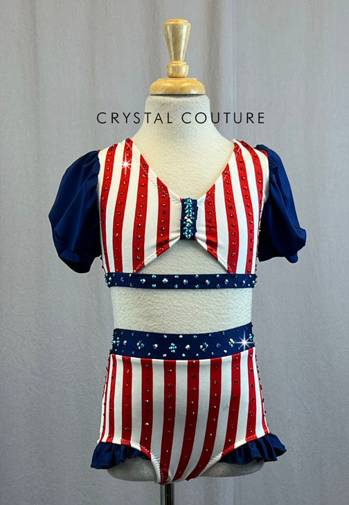 Custom Adorable Red and White striped two piece bra top with Navy Blue puffy sleeves and pinched front, with Red and White striped briefs with Navy ruffles. This costume is stage ready with rhinestones covering every detail. Over 2 gross of Siam rhinestones cover the red stripes throughout, and over a gross of Sapphire AB rhinestones cover the blue!