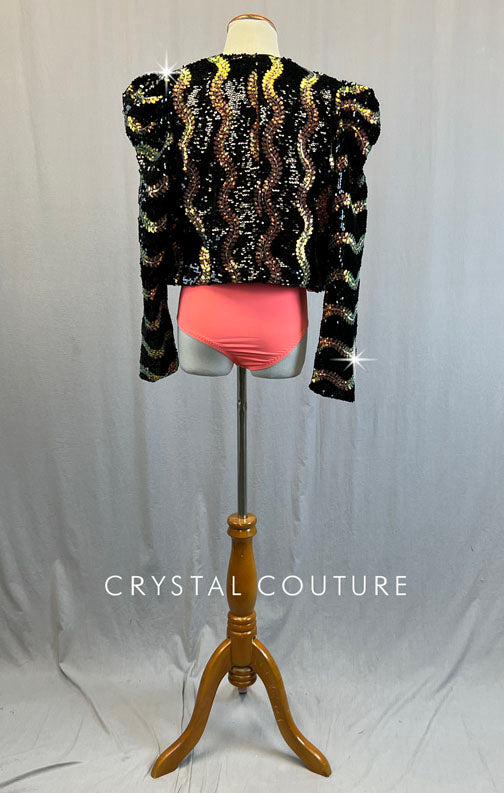 Custom Black and Iridescent sequined blazer has strong shoulders. Paired with Peach tank leotard.