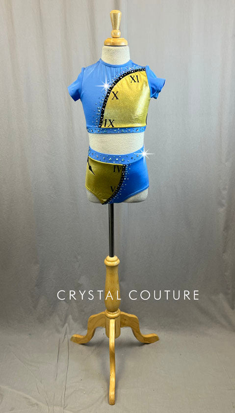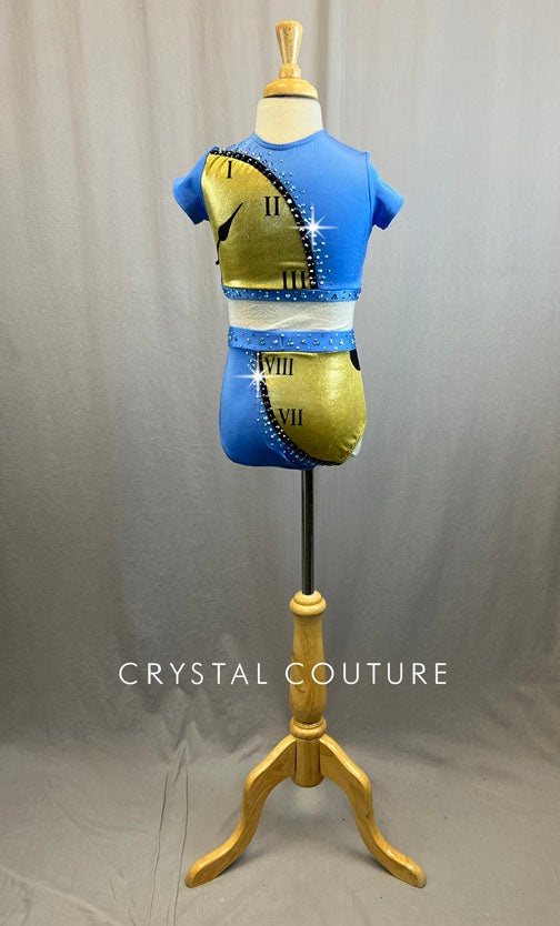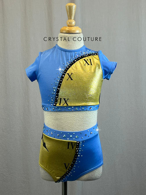 Custom Periwinkle Blue clock themed two piece crop top and briefs. What makes this unique is the Gold clock print on both the top and bottoms. The clock is trimmed out with Black elastic and then rhinestoned with Jet Hematite 20 and 30ss rhinestones as well as Light Sapphire Shimmer 20 and 30ss rhinestones along clock trim, waistband and top band. This costume sparkles with over 2 gross of rhinestones.