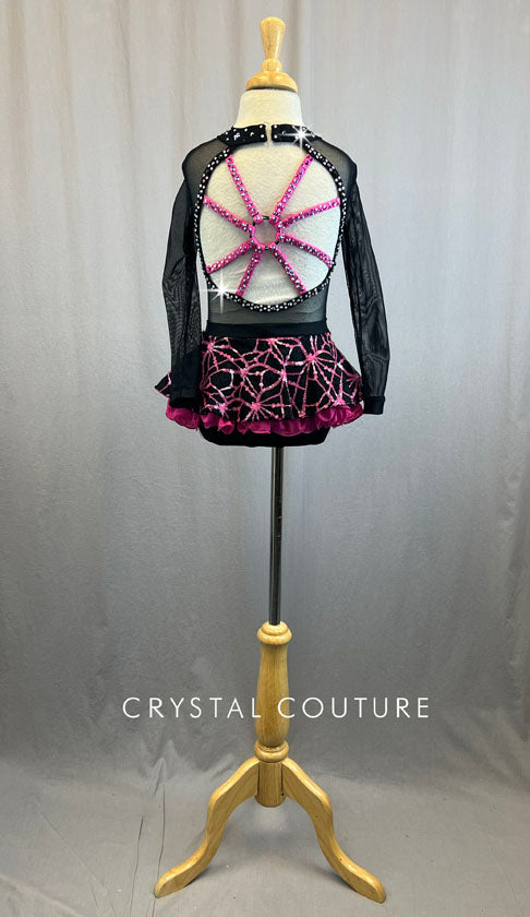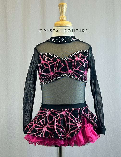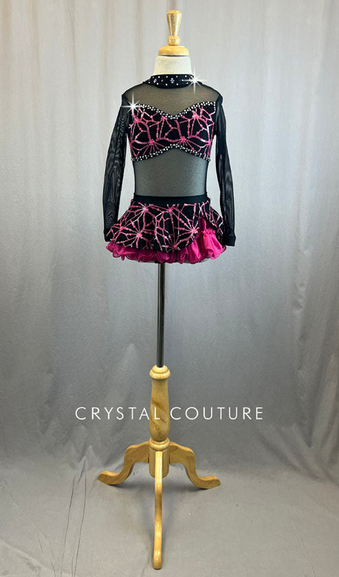 Custom Pink and Black Spiderweb Top and Skirt with Mesh and Rhinestones