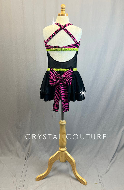 Custom Pink and Black zebra print top has criss cross straps in back. Double tiered Black skirt with trunks. Black mesh midriff connecting top and trunks. Lime Green zsa zsa edging. Zebra bow on back of skirt. 1 Gross of Crystal 20ss Rhinestones!