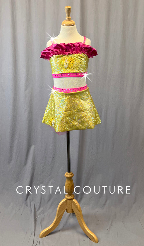 Super cute Bright Yellow top and skirt made from holographic dot lycra. Top has Hot Pink straps and band around rib cage with double Pink ruffle on upper neckline. Skirt has Hot Pink waistband and attached booty shorts. Double layer of Pink mesh under skirt. Embroidered lemon patches on center front of chest and on lower right front corner of skirt. *Accessories Include: Pink Hair Piece with Lemon Patch.