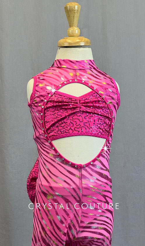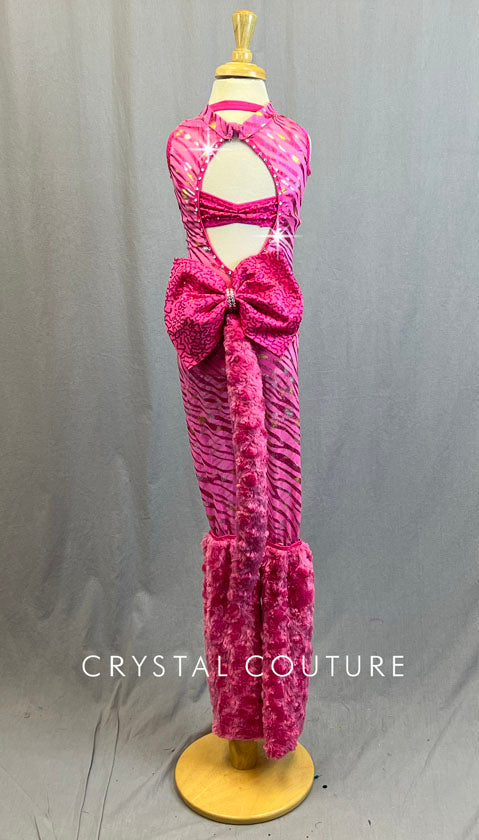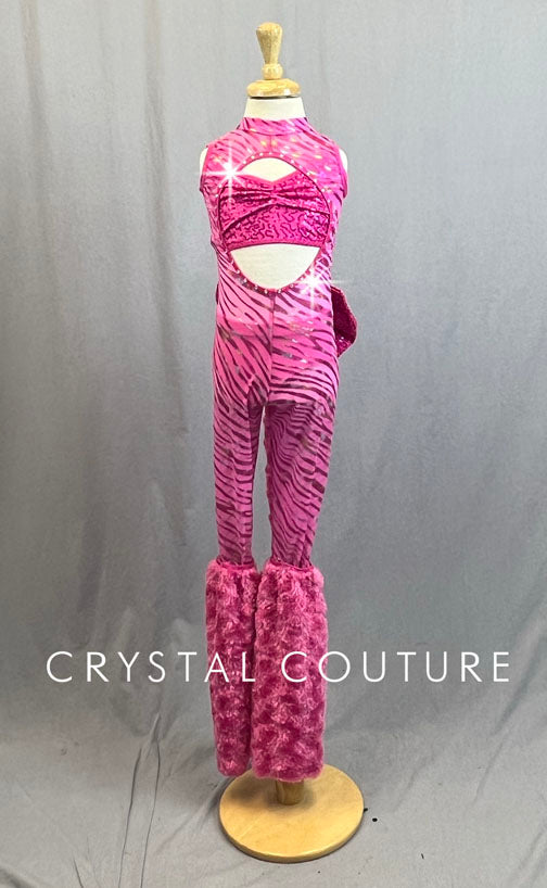Custom Pink mesh unitard with metallic zebra print. Circular cutout on back and front of body. Pink trunks and Pink zsa zsa halter top worn underneath. Furry Pink leg warmers are attached. Complete with fur tail and large zsa zsa bow. 0.65 Gross of Crystal 20ss Rhinestones!