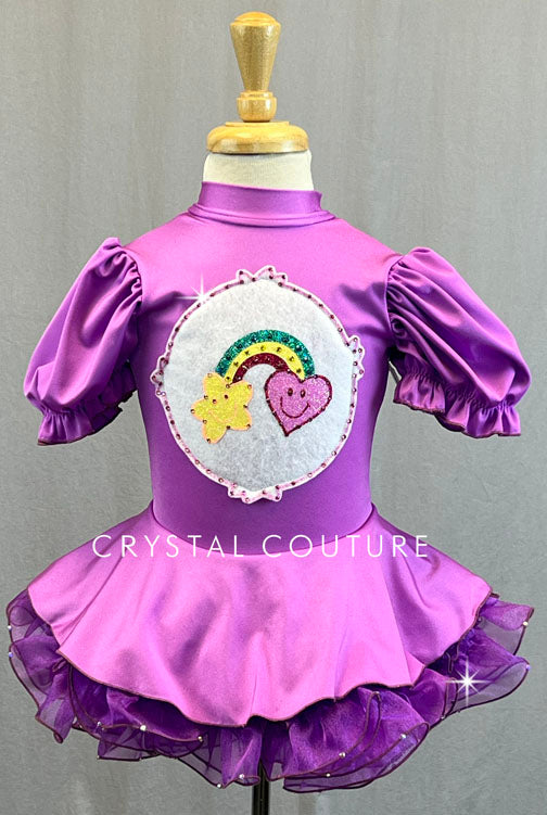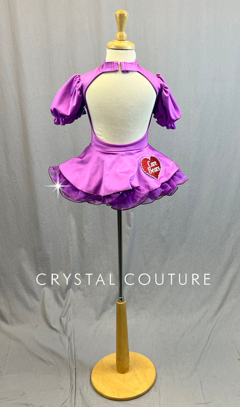 Custom Purple mock neck dress has puff sleeves and open back. Attached circle skirt has ruffled crinoline underneath. Red Care Bear heart patch on back of right hip and "Cheer Bear" patch on tummy. 1.5 Gross of Crystal AB 12ss, Rose 9ss, Fuchsia 9ss and 16ss, Light Peach 9ss, Citrine 16ss and Blue Zircon 16ss Rhinestones!