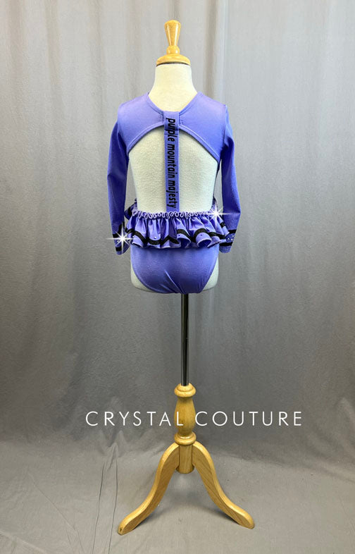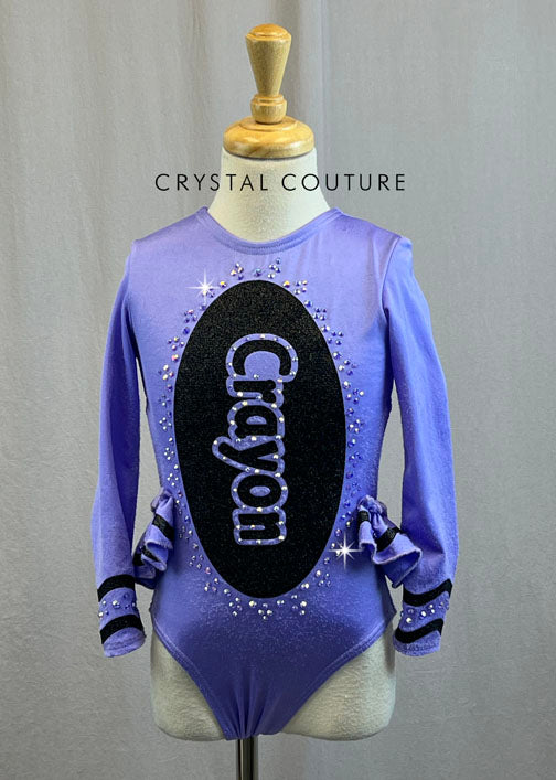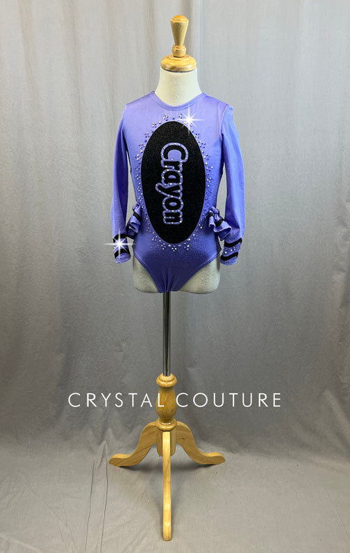 Adorable custom long sleeved Crayon leotard with front torso logo in Black sparkly vinyl. Traditional Black wavy crayon details along wrists and ruffles. Over a gross of Unfoiled Crystal AB rhinestones add that sparkle for the stage for this unique and fun design.