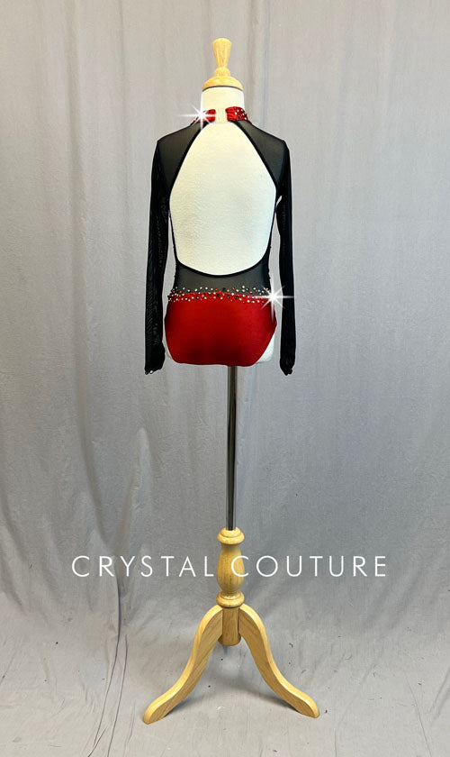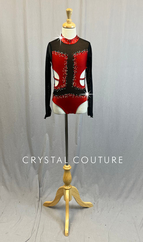 Custom Red Leotard with Black Mesh Sleeves and Cutouts - Rhinestones