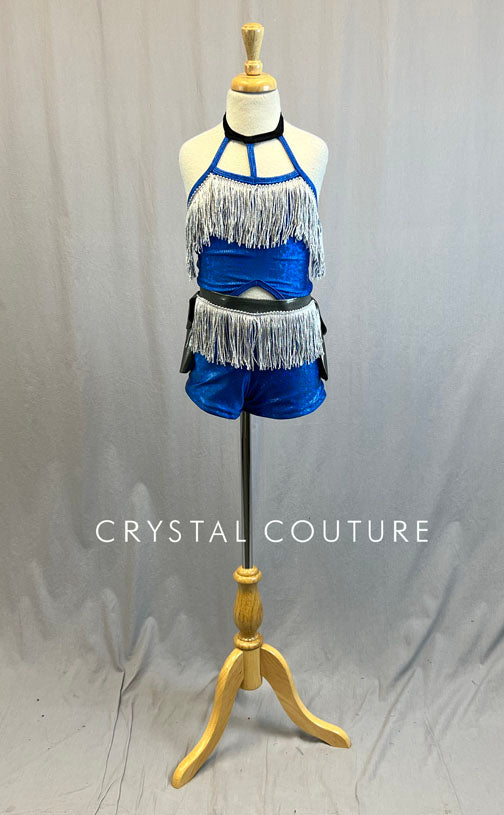 Custom Royal Blue Holographic Biketard with Chrome Back Skirt and Fringe