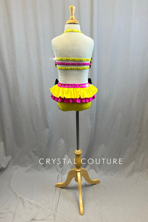 Custom Yellow and Pink Cheetah Two Piece with Ruffle Half Skirt and Bow Details - Rhinestones