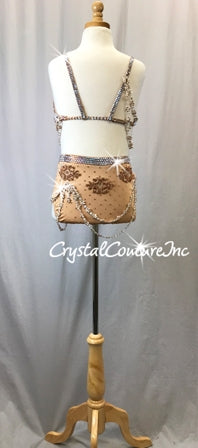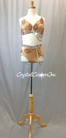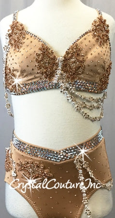 Beautiful custom made Dark Nude lycra halter bra-top and matching trunk with draping Ivory rhinestoned lace trim. Costume is accented with Lt Peach rhinestone appliques and lots of Swarovski rhinestones!