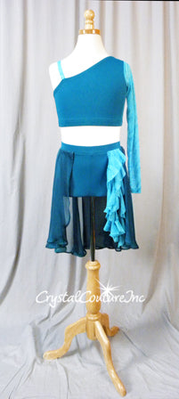 Dark Teal Blue 2 Piece Asymmetrical Top and Booty Shorts/Chiffon Skirt