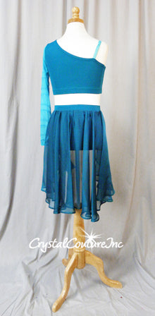 * Seamstress Sample - BRAND NEW custom made asymmetrical Dark Teal Blue lycra crop top and booty shorts with Teal Blue chiffon 3/4 skirt. Costume has Teal Blue sheer glitter mesh strap, long sleeve and tendrils at hip.