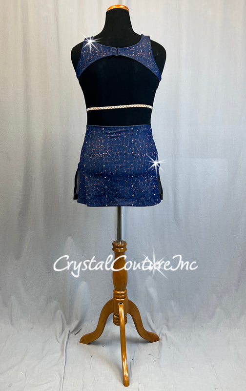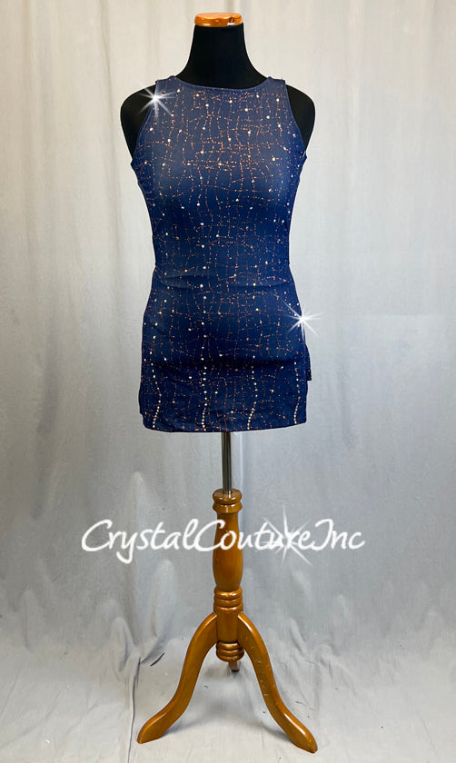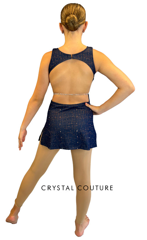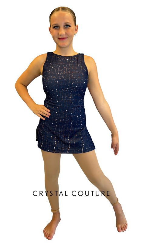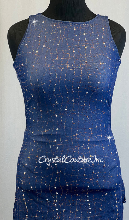 High neck mini dress with open back and attached lycra trunks. Denim look alike fabric has Bronze detailing in grid-like pattern. One single thin strap across back covered with Rhinestones.