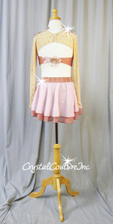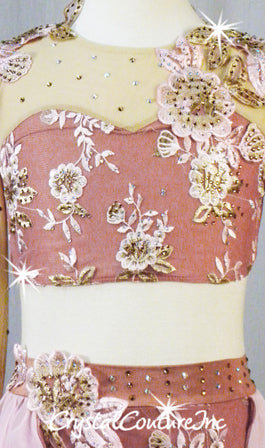 Very pretty Dusty Pink, Lt Pink and Nude 2 piece costume. Base of the costume is Dusty Mauve lycra crop top and trunks with chiffon Lt Pink/Dusty Pink back skirt and Nude sheer mesh neckline and long sleeves. Top and trunk are covered with Dusty Pink embroidered sheer mesh with Lt Pink/Gold floral design decorated with rhinestones.