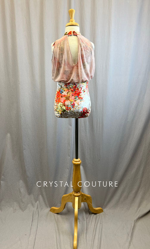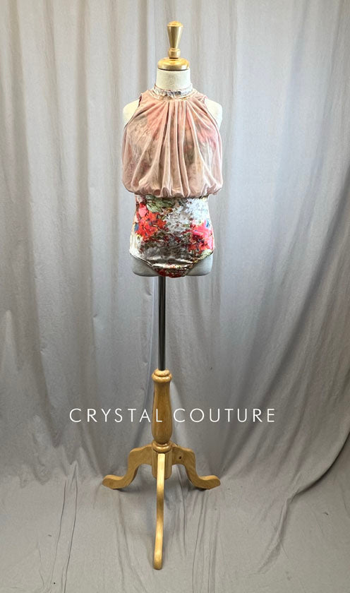 Double lined floral pattern mock neck velvet leotard with keyhole back and hook closure. Blush colored loose mesh overlay just over bust and upper back.