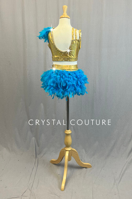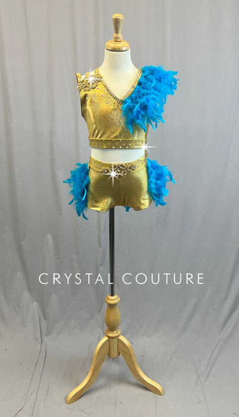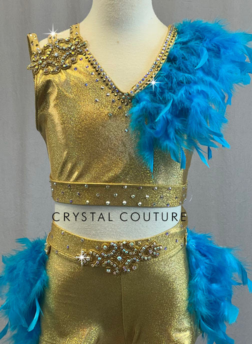 Gold Metallic Two Piece with Blue Feathers and Appliques - Rhinestones