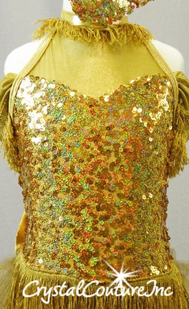 Metallic Gold lycra leotard with Gold zodiac sequined bodice. Costume has Gold fringe on neckline, off-the-shoulder sleeves and drop waist skirt and large Gold bow in back.