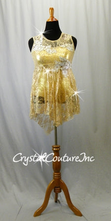 Gold Shimmer Leotard with Nude Floral Lace Overlay and Skirt - Swarovski Rhinestones