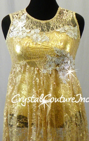 Gold lycra shimmer leotard with Nude floral lace overlay with tiny Gold sequins. Costume has sheer lace neckline and skirt. Decorated with Silver/Gold embroidered appliques and Swarovski rhinestones!!