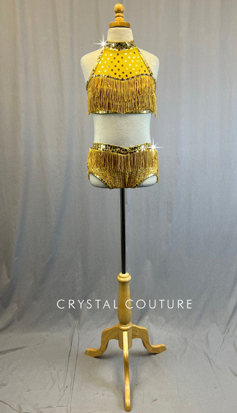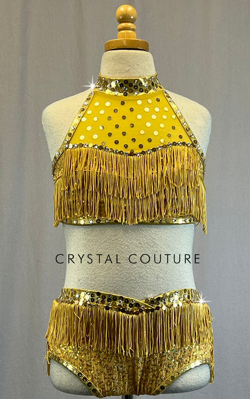 Two piece Gold zsa zsa sequin lycra halter top and trunks, featuring Gold 3 inch fringe, tiered on top and trunks. Gold sequins and 2 gross of size 30ss Crystal rhinestones add that extra sparkle all along the trim of the top and waistband.