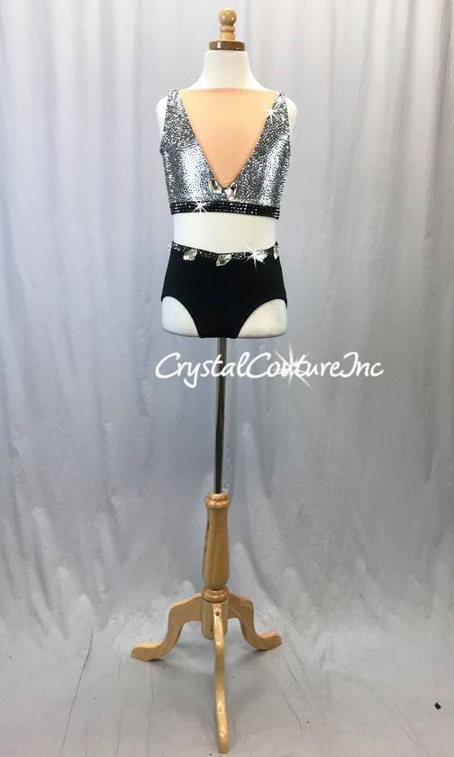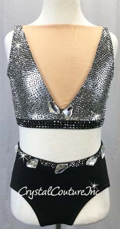 STRIKING custom made Graphite metallic top with Black trim and Nude sheer mesh V-neck and back with Swarovski rhinestones pattern. Paired with Black trunks. Costume is embellished with various sized Swarovski rhinestones and Swarovski flatback shapes!