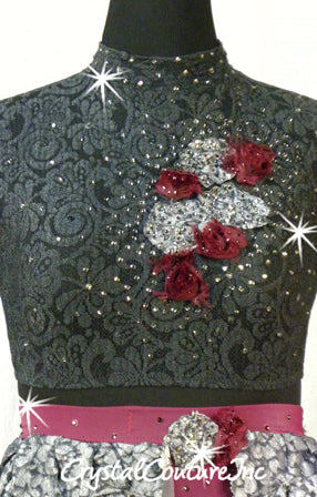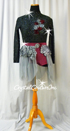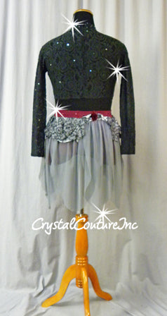 Sophisticated Gray and Burgundy 2 piece lace crop top and booty short/half skirt. Gray floral lace L/S top is decorated with Swarovski rhinestones and matching Silver/Gray fabric used on the skirt. Gray sheer mesh skirt with shorter pattern "pick-up" skirt and Swarovski rhinestones. Add your own bra-top underneath to complete the look!