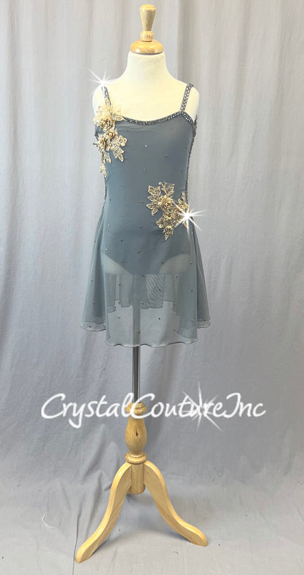 Gray camisole leotard has squared open back and attached mesh mid-length dress. Champagne colored 3D floral appliques on right side of chest and left hip.