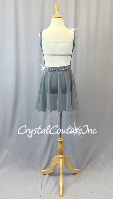 Gray Camisole Open Back Leotard with Attached Mesh Dress - Appliques & Rhinestones
