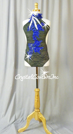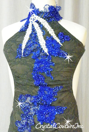 Custom made Gary floral lace leotard with mock-neckline and low open back. Costume is decorated with Royal Blue floral embroidered/lace appliques, embroidered Ivory trim and lots of Swarovski rhinestones!