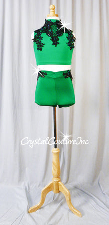 Custom Green 2 Piece Top and Booty Shorts w/Black Appliques - Swarovski Rhinestones