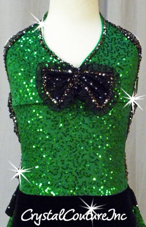 Green Zsa Zsa Sequin and Black Velour Leotard/Ruffle Half Skirt - Swarovski Rhinestones