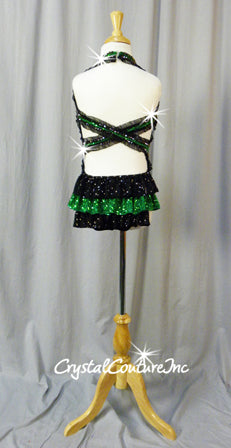 Green zsa zsa sequin and Black velour halter leotard with low open back. Costume is accented with Black sheer ruffles, Swarovski rhinestones and alternating Black/Green tiered ruffled half skirt.