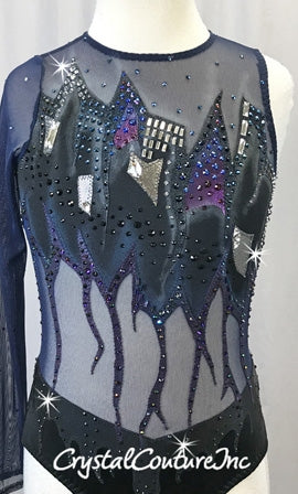 Amazing! Custom made Navy mesh and Black lycra leotard. Leotard bodice is sheer Navy mesh with a rounded neck, one long sleeve and back zipper. Brief is Black lycra. Hand painted fabric is detailed throughout with rich Purple, Blue and Graphite tones, highlighted with Swarovski rhinestones. Detail and custom work through out this costume is Amazing!!!