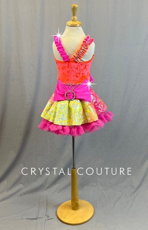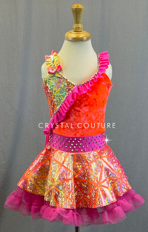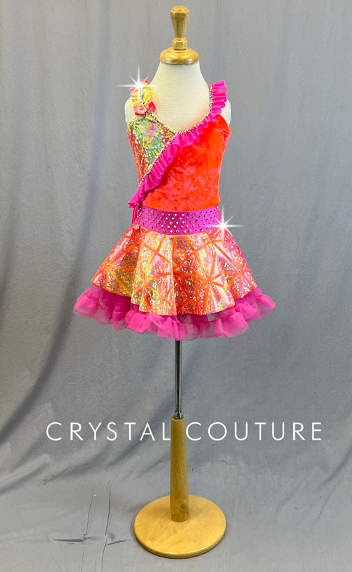 Hot Orange and Pink Holographic Geometric Dress with Ruffles- Rhinestones
