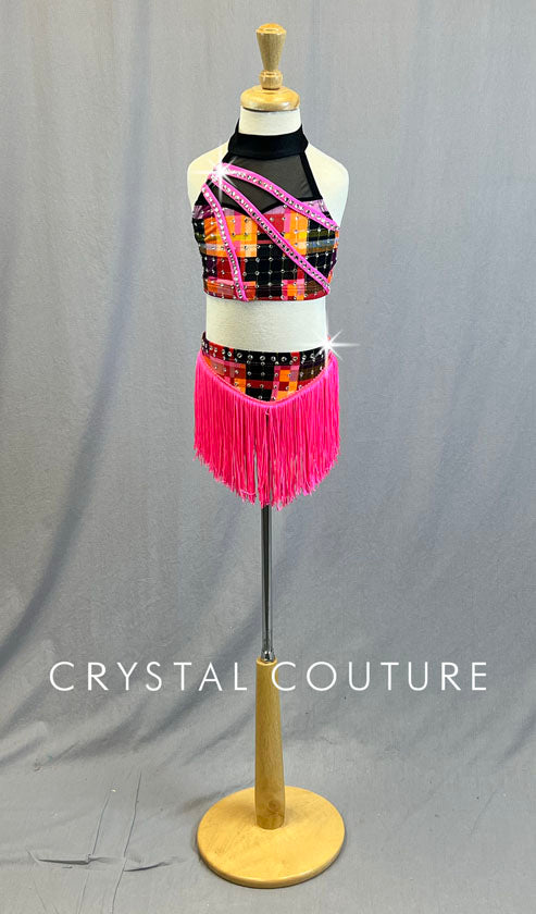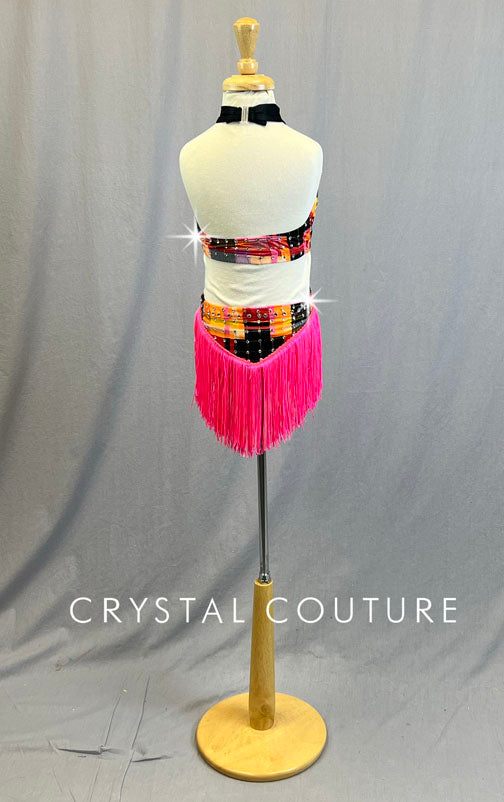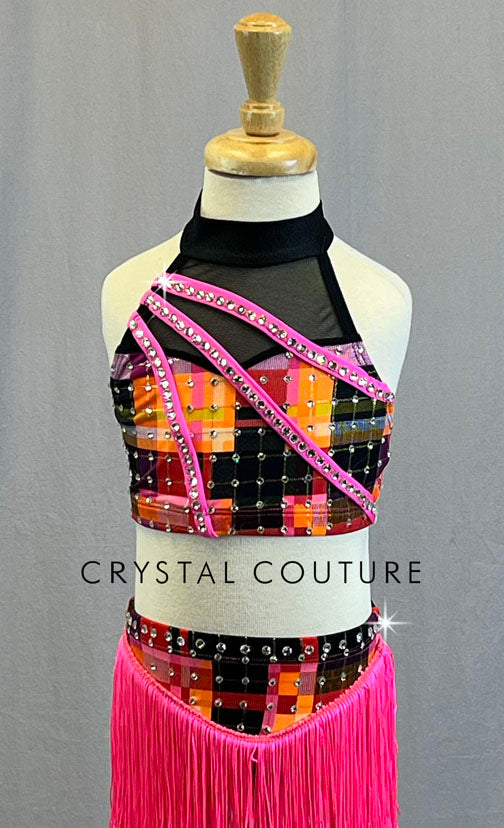 This bold two piece is a showstopper! Adorable halter top and trunks in plaid lycra, featuring Pink, Orange, Purple and Black. Halter neck in Black mesh with sweetheart neckline in plaid. Hot pink Lycra strips across the front of the top to add dimension and fun! Plaid trunks boast a Hot Pink 6 inch fringe skirt with center V. This costume is accented with Crystal rhinestones in size 20 and 30ss at every square on the plaid print and Hot Pink trim on the top. She's adorable!
