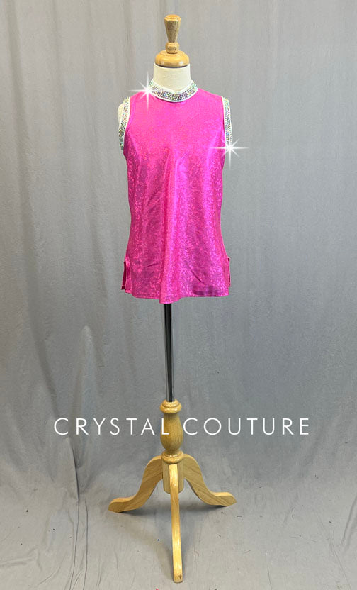 Hot Pink holographic mini dress is has small side slits and keyhole back opening. White trim around armscye and high neckline. 4.5 Gross of Crystal AB 20ss Rhinestones!
