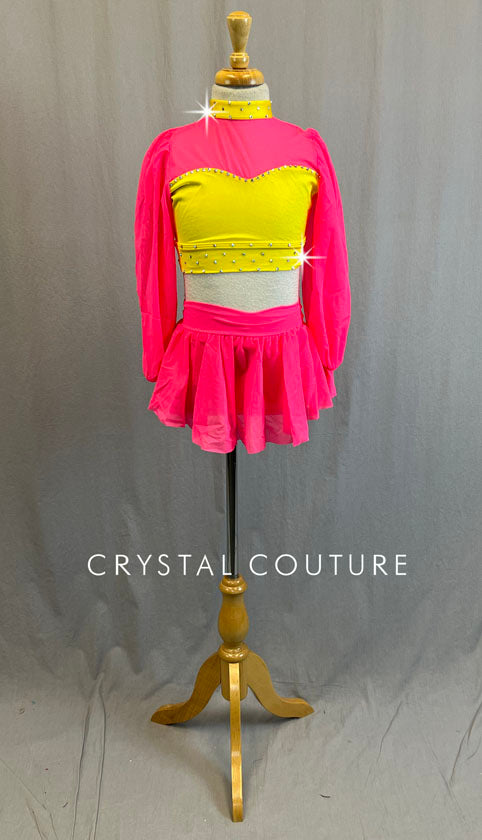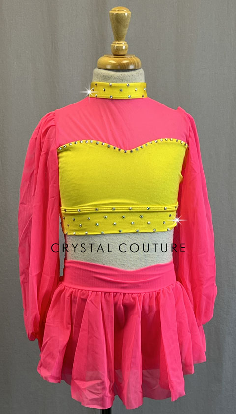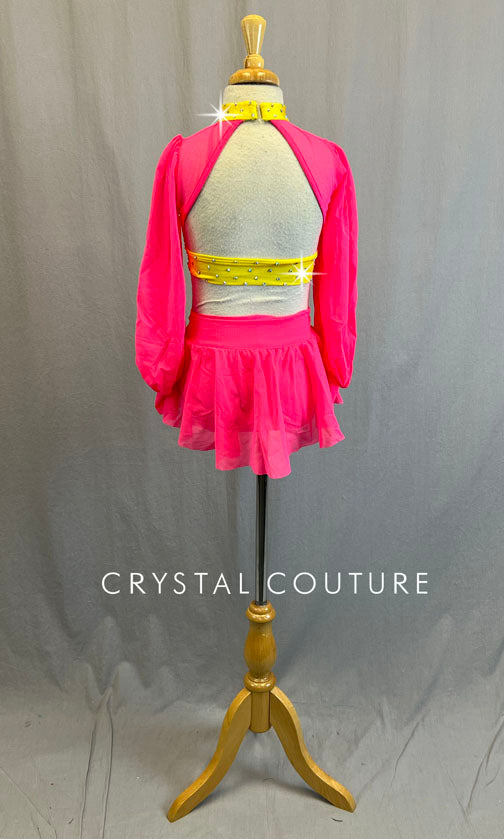 Hot Pink & Neon Yellow Peasant Sleeve Top and Skirt - Rhinestones