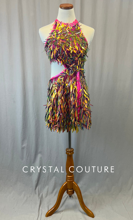 High neck dress has right side cutout and left side slit. Attached Hot Pink trunks and detailing and straps. Iridescent oblong sequins cover entirety of dress.