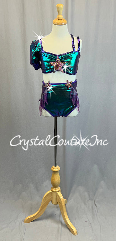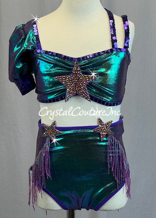 Mermaid inspired two piece asymmetric costume. Main base is made from an irridescent Green lycra. Top has sweetheart neckline with two narrow purple straps on left shoulder and puffed sleeve on the right. Large rhinestoned star patch on front center of top, and two smaller matching stars on back. Trunks have a purple beaded fringe on back and on front of hip bones. Seven small matching stars around waist of trunk. One large sequined star, and one small rhinestoned star are included as extras.