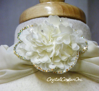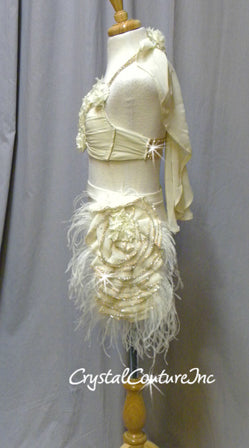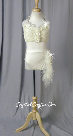 * Gorgeous Ivory, custom made, one-of-a-kind 2 piece solo costume! Pleated bra-top is covered with Ivory chiffon. A delicate chiffon drape is attached at the back of the halter neck, and dimensional floral trim and Swarovski rhinestones decorate this graceful top. Briefs are made of Ivory lycra and are fully lined. A layered chiffon bustle with flower and feather accents is attached at the front left hip. Amazing!!!