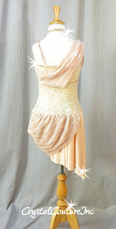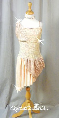 Gorgeous vintage inspired Ivory and Lt Pink dress. Costume is made of Ivory sheer floral sequined lace bodice with attached Nude lycra booty shorts. A light Pink shimmery crinkled woven drapes across the top, back and half skirt. Asymmetrical underskirt is made of coordinating Light Pink textured lycra. Swarovski rhinestones decorate the trim, straps and hemline This is a stunning costume!