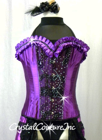 Latin Inspired Purple & Black Corset, Leotard & Tiered Skirt - Swarovski Rhinestones